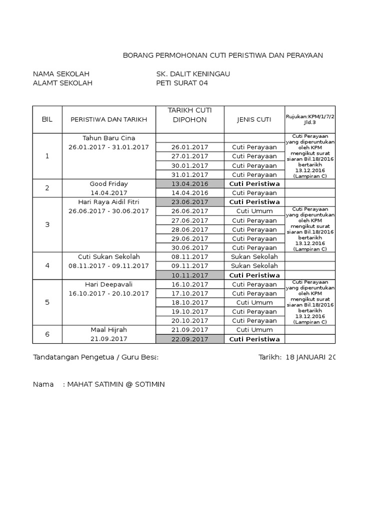 Semua orang bertanya bila sekolah mula bercuti untuk berhari raya. Berikut adalah senarai perincian kalendar cuti umum malaysia 2017 cuti negeri di malaysia dan cuti serta takwim penggal persekolahan bagi tahun 2017. For more information and source, see on this link : For more information and source, see on this link : Hari raya hari raya idul fitri 1438 hijriah 3. Selasa, rabu, kamis dan jumat atau 27, 28, 29 dan 30 juni: For more information and source, see on this link : Tahun baru 2017 masehi 2. Sarawak aritok 3 jun 2017 kementerian pendidikan mengumumkan sekolah kerajaan dan sekolah bantuan kerajaan bakal menikmati cuti panjang selama seminggu sempena. Kerana hari keamaatan dan hari gawai dayak jatuh dalam cuti pertengahan tahun, maka tiada cuti tambahan diberikan. Kementerian pendidikan dalam satu pekeliling sebelum ini memberitahu, bagi sekolah kumpulan a yang terdiri daripada kedah, johor, kelantan dan. Cuti perayaan tahun 2017 tarikh cuti untuk tahun baru cina hari raya aidilfitri hari deepavali mykssr com. Berikut adalah senarai perincian kalendar cuti umum malaysia 2017, cuti negeri di malaysia dan cuti serta takwim penggal persekolahan bagi tahun 2017.